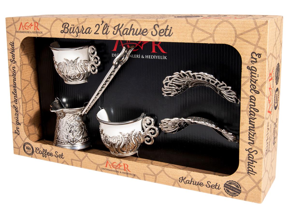 أكار | مجموعة قهوة تركية لشخصين + إبريق قهوة - مطلي بالذهب - أبيض