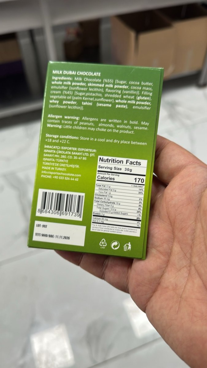 تتميز هذه التحفة بطبقة سميكة وسخية من كريم الفستق المخملي، المليء بالنكهة الغنية والمكسراتية. هذا الحشو الناعم محشو بـ قطع الكنافة المقرمشة والمخبوزة باللون الذهبي، مما يخلق الملمس المقرمش والكريمي المميز الذي يحدد شوكولاتة دبي الحقيقية. كل هذا مغطى بشوكولاتة الحليب الغنية المميزة من بي دو.