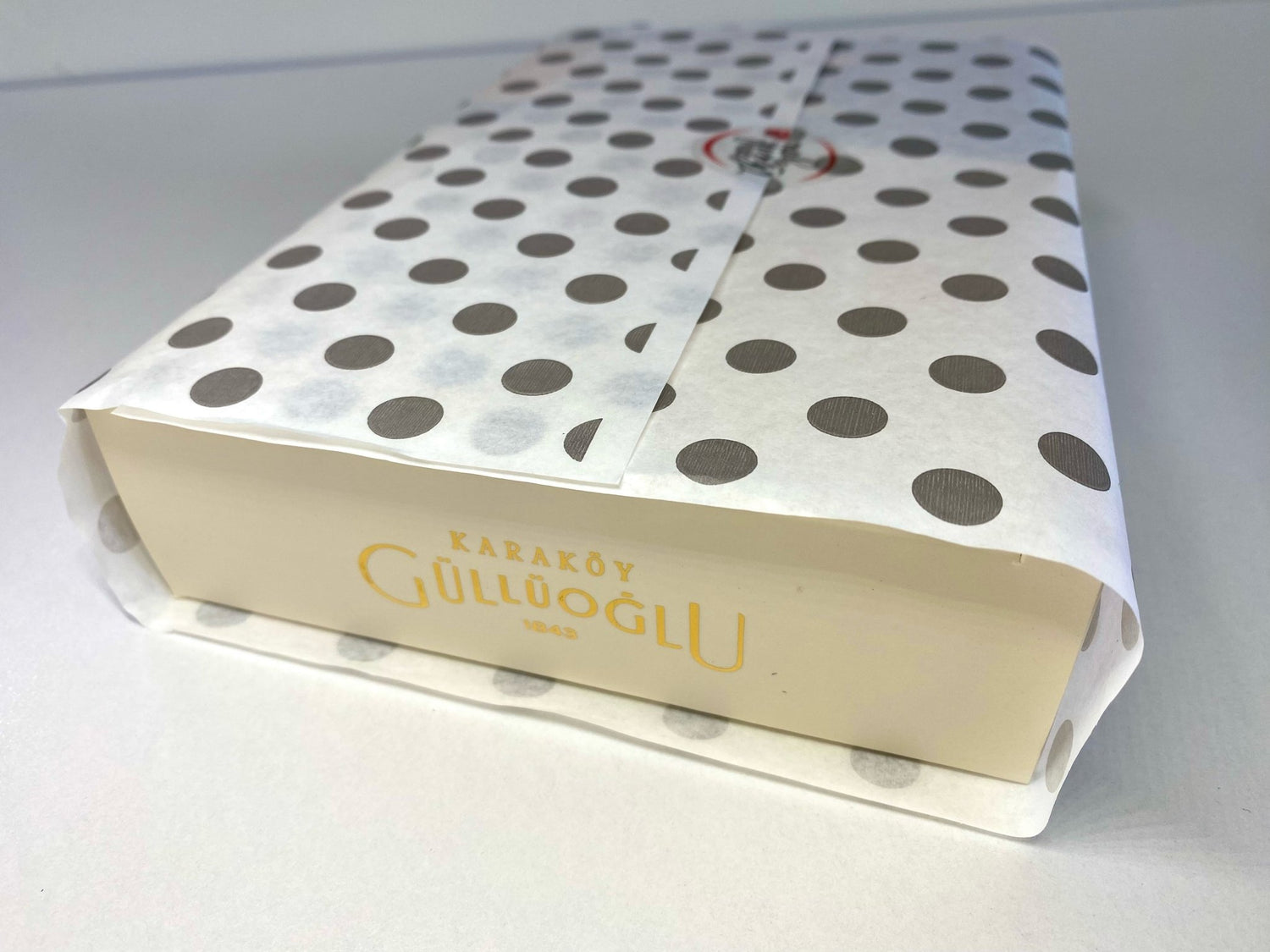 تقدم Karakoy Gulluoglu نسختها اللذيذة من البقلاوة بمعجون الفستق. يتم صنعها يدويًا باستخدام الفستق المطحون ناعماً، السكر البودرة، الماء، ثم يتم خلطها لخلق القوام المثالي قبل الطهي. غالبًا ما يتم الاستمتاع بمعجون الفستق مع الكعك، الحلويات، أو حتى بمفرده مع فنجان من القهوة أو الشاي. مهما كانت تفضيلاتك، استعد لتجربة تذوق رائعة مع هذه الحلوى الحلوة والمكسراتية.