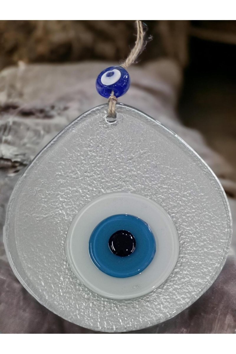 - المواد: خرز أزرق وفضي ورمادي مشدود يدويًا، خلفية شفافة